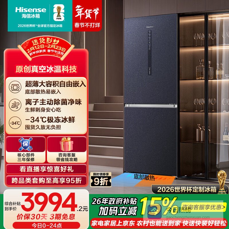 海信415L两门冰箱真空保鲜自由嵌入一级能效风冷净味蓝色世界杯定制冰箱BCD-415WTDGVBPIV国家补贴¥