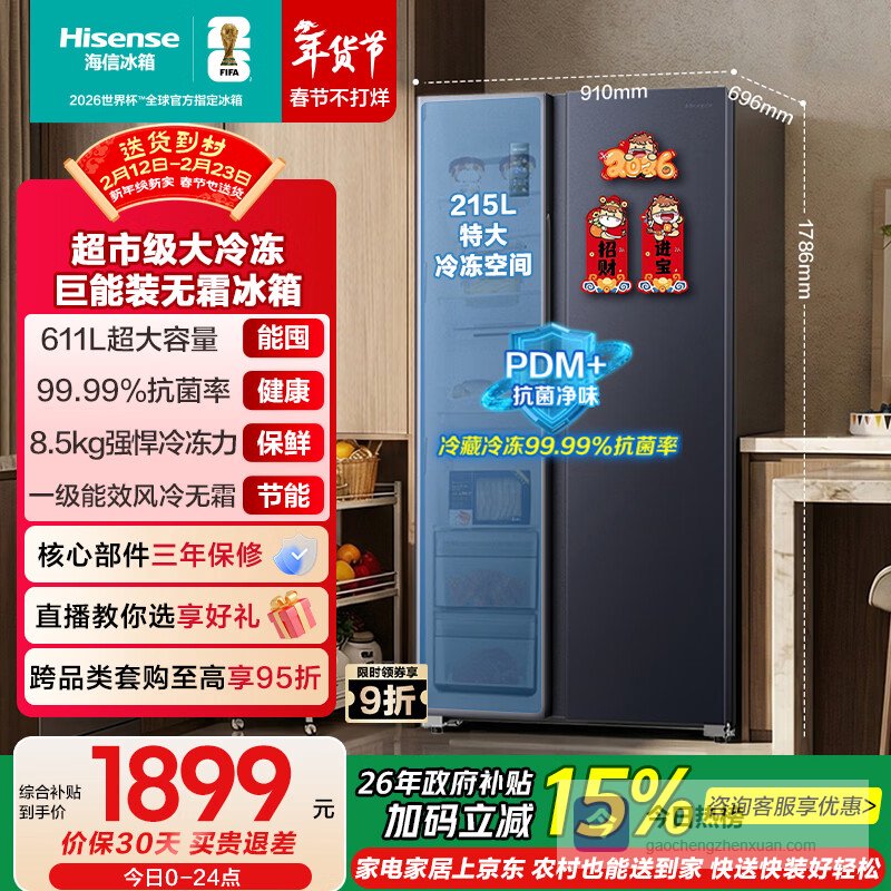 海信611L对开门冰箱超大容量一级能效风冷无霜抗菌超薄变频电冰箱灰色双开门BCD-611WFK1DPQ国家补贴¥