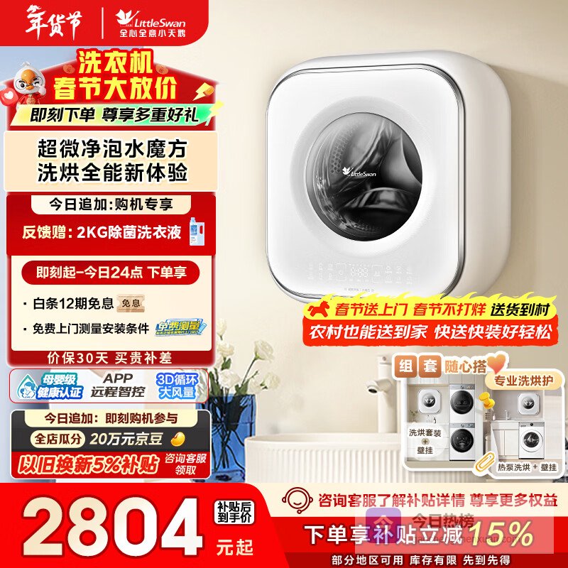 【京东自营】小天鹅小海绵2.0内衣洗衣机小型全自动家用3KG壁挂洗烘一体婴儿迷你TD30M80W以旧¥