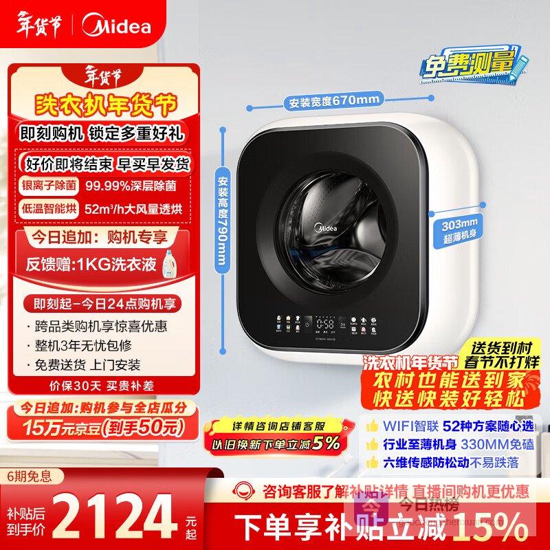 迷你轻巧设计优势:它的机身厚度仅300mm,方便在各种家庭空间中灵活摆放,充分利用有限的室内空间。将洗衣机挂在墙上,既节省地面空间,又能为房间增添现代感。对于追求简约与美观的家庭来说,这款洗衣机不仅提升了实用性,还让家居环境更具时尚气息,成为家中亮眼的存在。