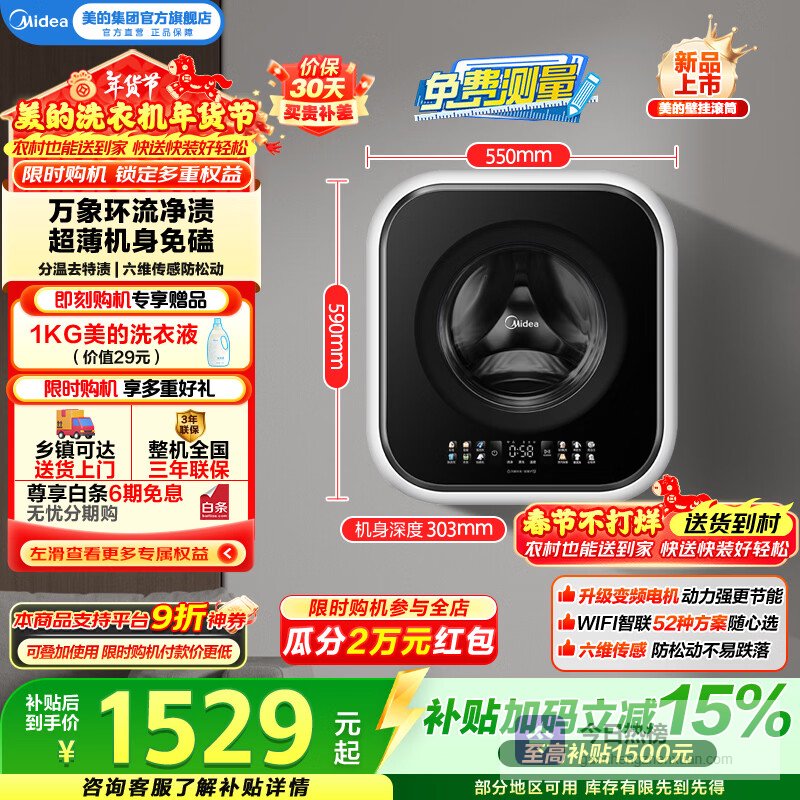 【品牌直营】美的壁挂滚筒洗衣机全自动家用3公斤容量银离子除菌高洗净比95℃高温除菌变频家电换新补贴M¥