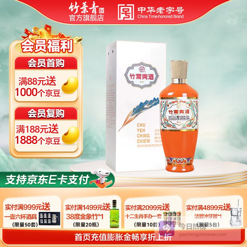 竹叶青酒 汾酒 荣耀 山西杏花村 优质汾酒基酒 露酒 送礼 53度 350mL 1瓶 橙瓶 礼盒装¥
