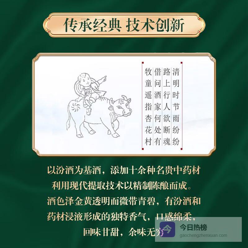45度475mL×6瓶的箱装设计,恰似酒桌的“定海神针”。采用杏花村优质汾酒基酒,配以淡竹叶、陈皮等十余味草本,酒体呈现琥珀光泽。