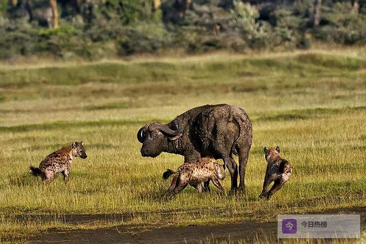 野牛集体合作反抗,狮子和斑鬣狗都很难捕获它们,甚至会被野牛反杀。