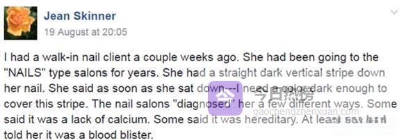 前几天,美甲师 Jean Skinner 在 Facebook 上写下一段经历,让无数人突然低头检查自己的指甲。