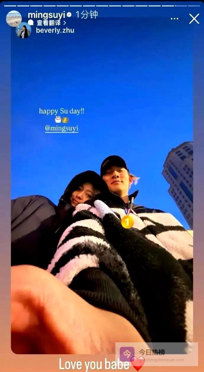 苏翊鸣夺金那天,朱易发了条“官宣”合照,配了一句“happy Su day!”。