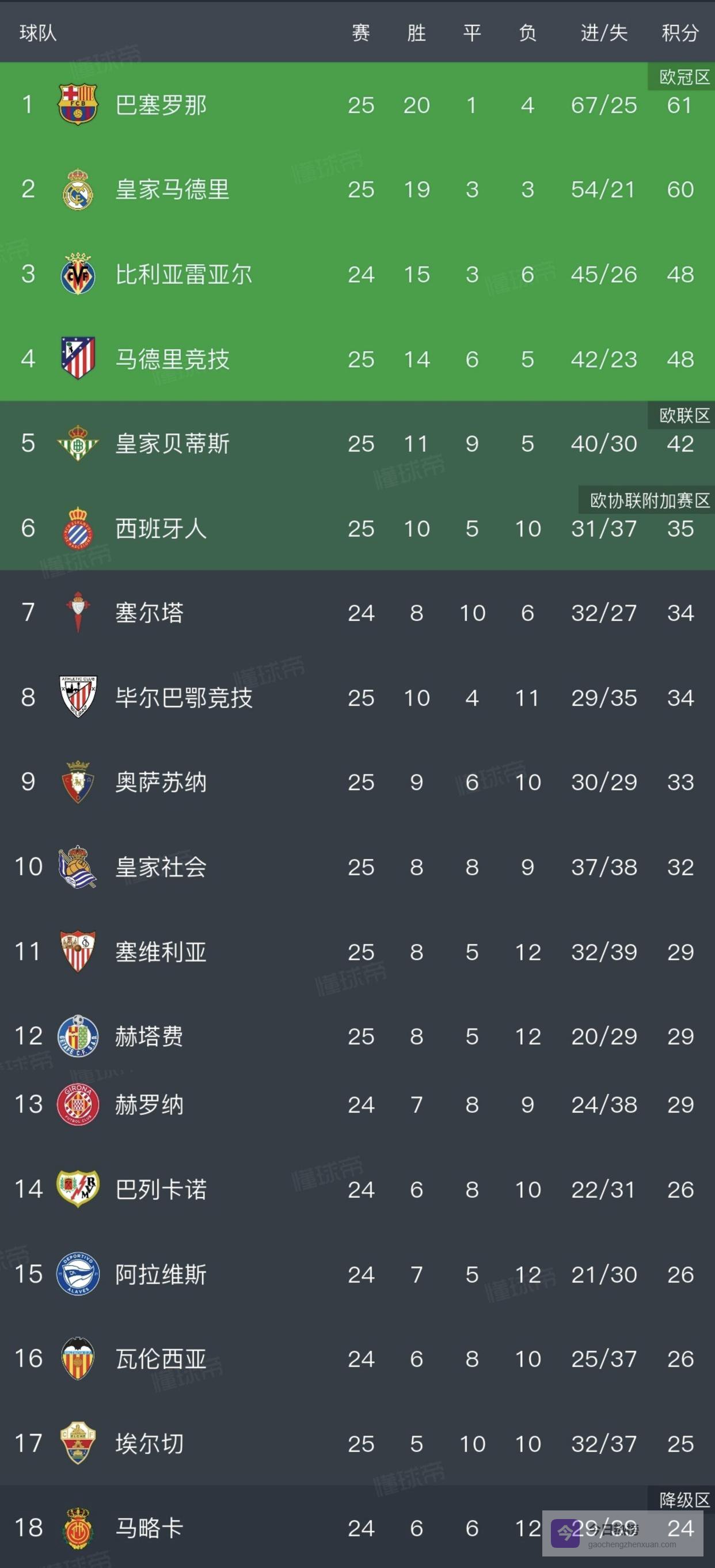 随着本轮比赛全部结束,西甲积分榜发生了显著变化。巴塞罗那以61分重返榜首,皇家马德里以60分退居第二,两队之间仅有1分之差。争夺欧冠资格的竞争同样激烈,比利亚雷亚尔以51分排名第三,马德里竞技以48分位列第四。在欧战区的还有皇家贝蒂斯和西班牙人等球队。