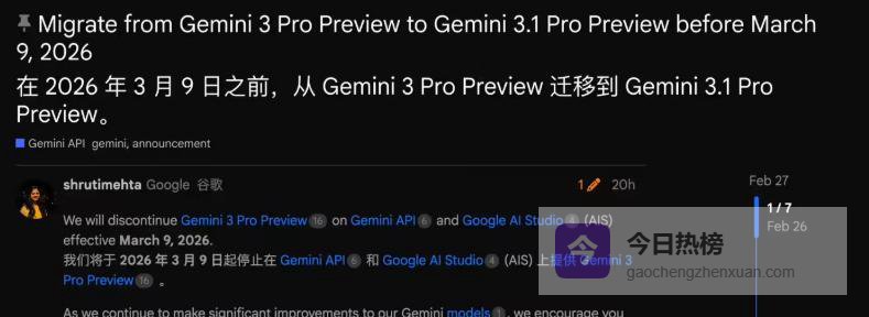 谷歌近日在官方开发者论坛发布重要通知,宣布将从2026年3月9日起,正式在 Gemini API 及 AI Studio 中停止提供 Gemini3Pro Preview 模型服务。为了确保业务不中断,谷歌敦促所有相关开发者尽快完成向3.1版本的迁移工作。