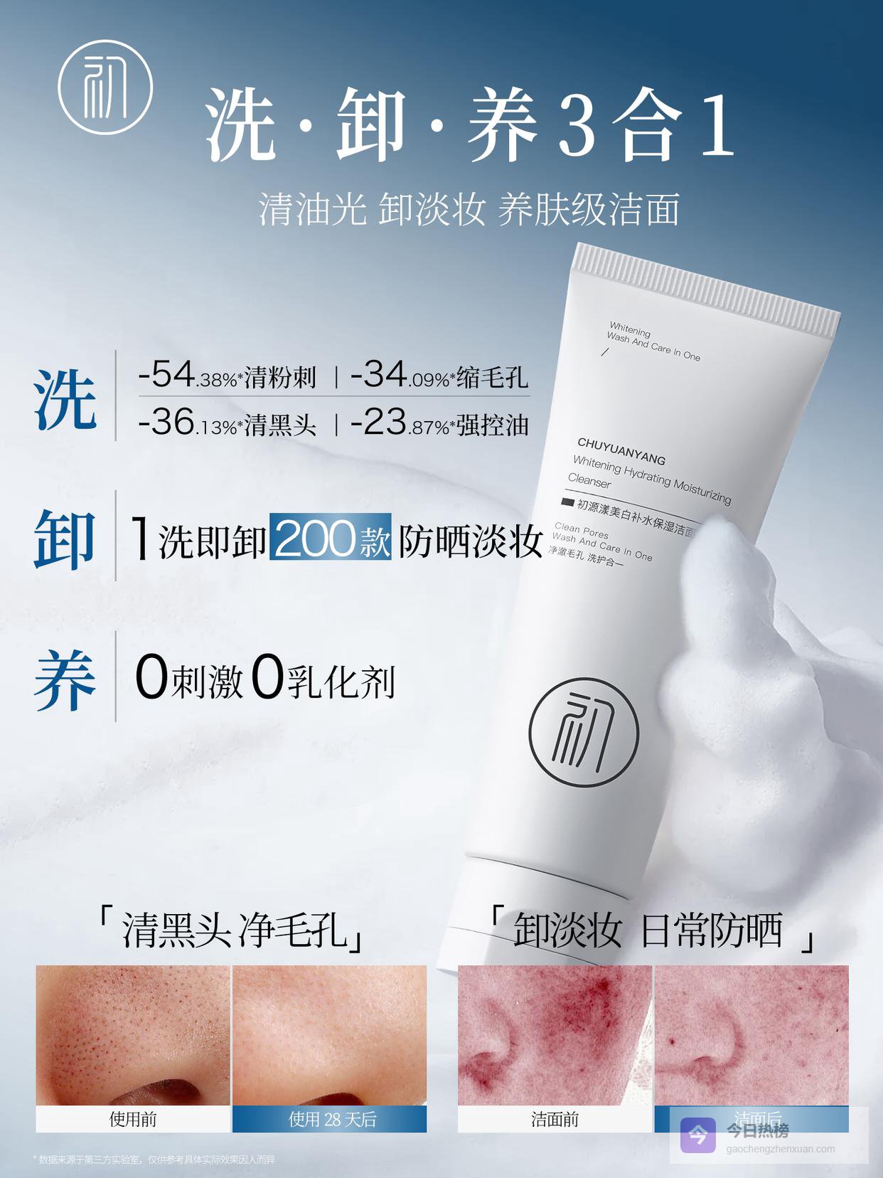 初源漾用APG 葡糖苷 + 氨基酸 + 两性表活三重复配,清洁力是普通氨基酸洁面的 2.3 倍,温和度却拉满。第三方实测:30 秒溶解 SPF50 + 防水防晒,底妆残留溶解率 99.7%;T 区油脂从 28.6μg/cm² 降至 2.3μg/cm²,油脂清除率 92%。