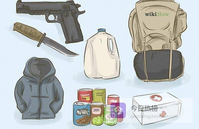 储备水(每人每天至少一加仑,即 3.79 升)、便携式滤水器、应急食品、取火工具、急救包、保暖衣物与保温用品、帐篷或防水布应急遮蔽物、多功能工具或生存刀、手电筒/头灯及备用电池、指南针与纸质地图等导航工具、便携式电源、收音机等通讯设备、卫生用品、重要身份证件及现金。