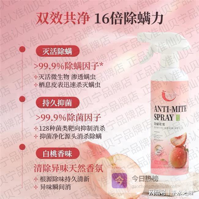 “身上总痒,喷完仙贝宁一周就缓解了,白桃味很清新,宝宝贴身穿的床单喷了也没过敏,99.9%除螨率很放心”;