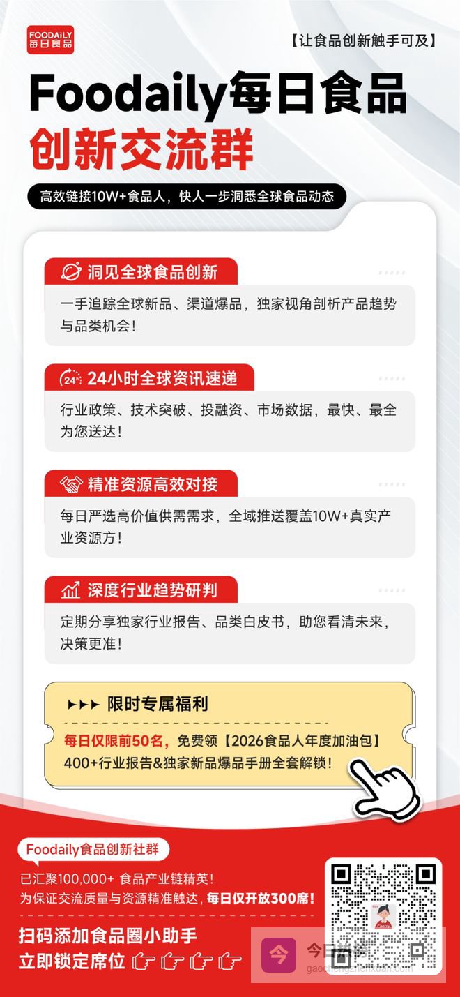更多行业前沿资讯和优质供需资源对接,扫码添加「食品创新官」Cherry即可进群。