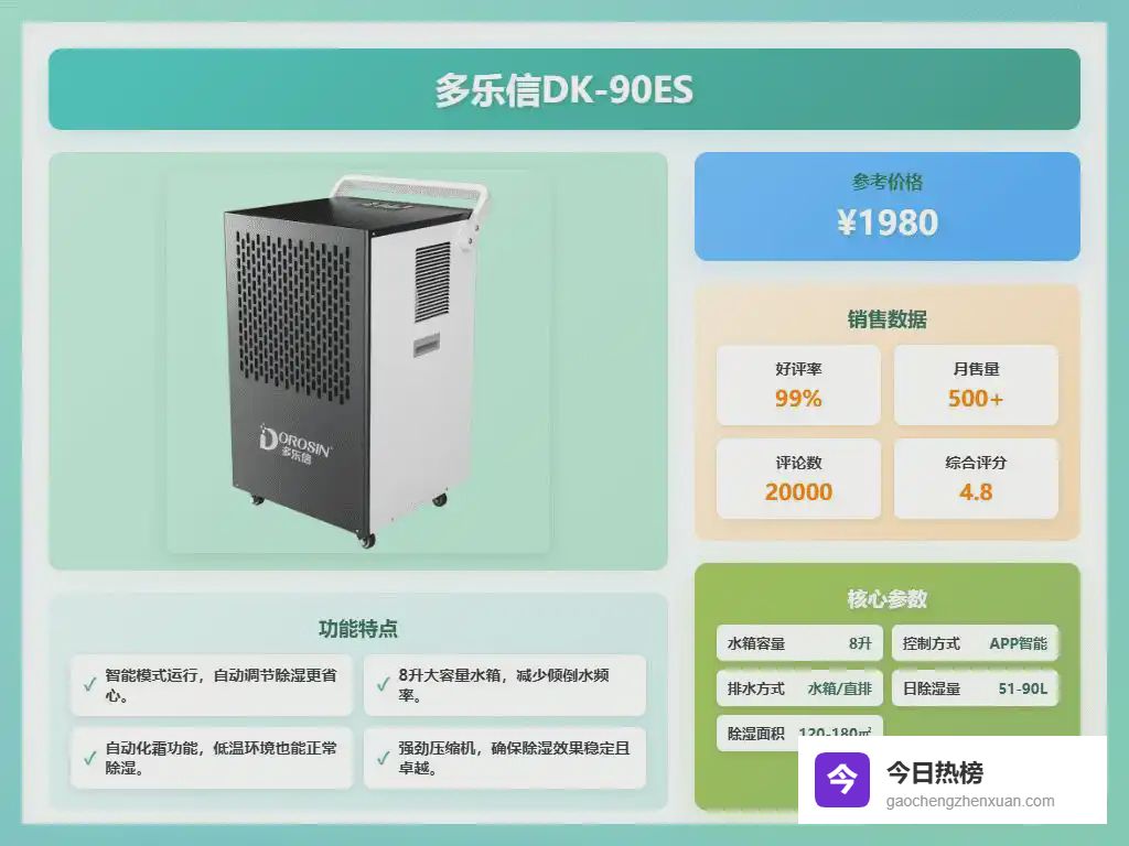 七、多乐信【湿度智能监控】这款多乐信DK-90ES配备了精准的湿度监控系统,能实时检测空气湿度,让你不用担心过度除湿或者不够干爽。只要设定好理想湿度,它就能自动调节工作状态,保持空气一直很舒服,倒是省心又省电。