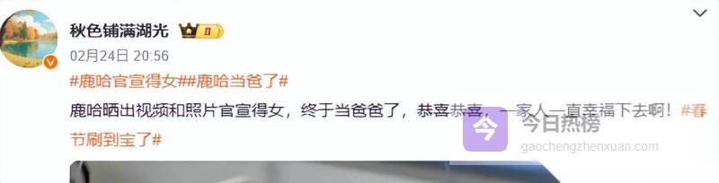 2月24日,他用“鹿哈”艺名发微博官宣,一组照片加一段视频,妻子兔兔病床稳稳躺着,新生女儿被捧在怀里,小小的一团,看着就让人心软。