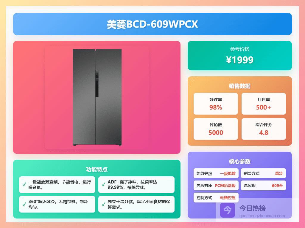 选美菱一级能效冰箱,首先还是得看你家的人口和需求。如果家里人多,经常囤货,那600升以上的对开门或者多门冰箱肯定更适合你,像美菱BCD-609WPCX这种,容量超大,能装下不少东西。如果家里人少,对容量要求不高,那就考虑300-500升左右的。另外,还得看看你对冰箱的功能有什么特殊要求,比如是不是需要干湿分储、母婴专区、或者智能WIFI控制等等。总之,根据自己的实际情况来选,别盲目追求大容量或者花哨的功能,实用才是王道,适合自己的才是最好的。