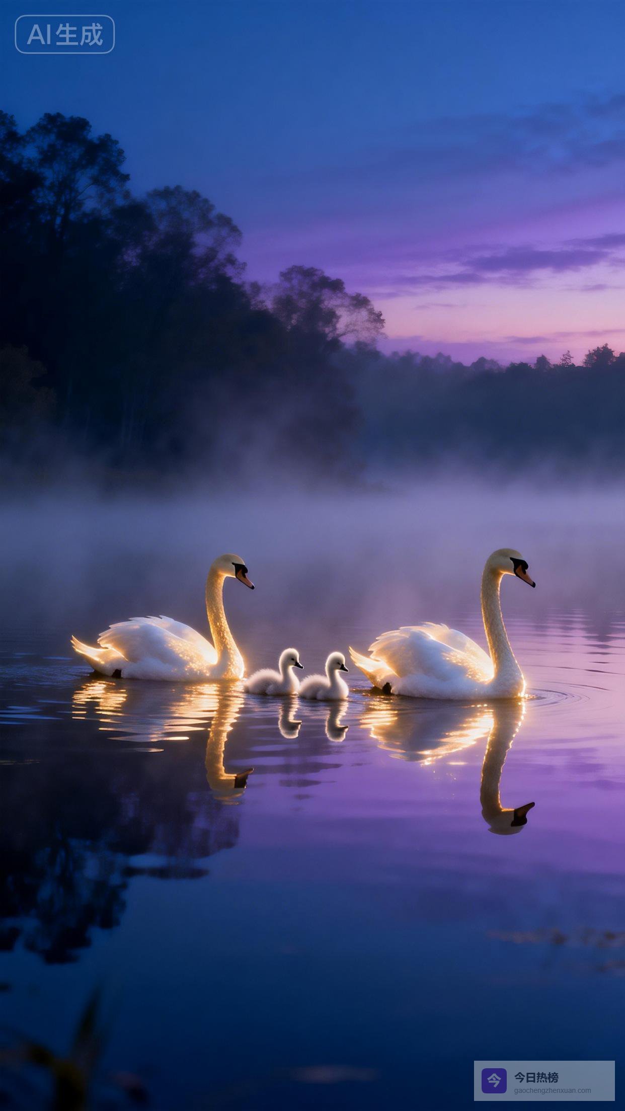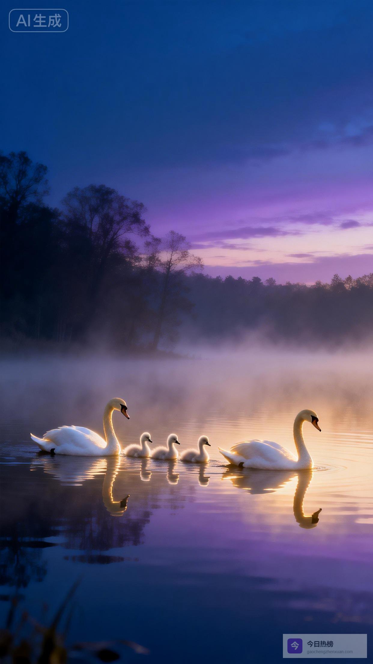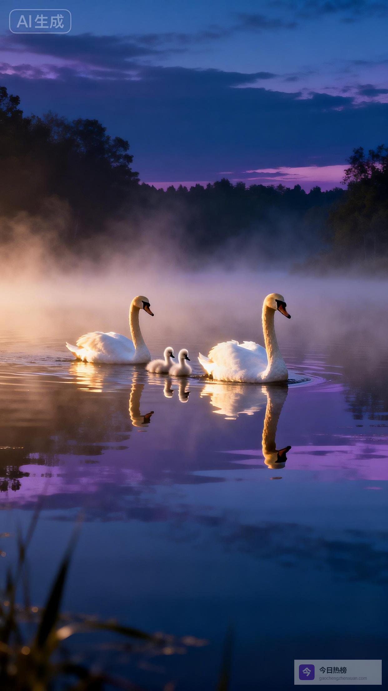 嘿,朋友们!今天想和大家分享一幅让我心都要融化的画面——紫粉色的晨雾中,一对天鹅带着两只毛茸茸的小家伙,在如镜的湖面上缓缓游过。这哪里是简单的风景啊,分明是自然写给人间最动人的情书。