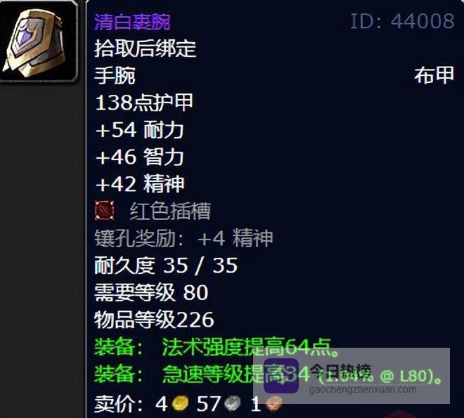 既然说到了法系DPS,那么往年热门的清白裹腕还是依旧极品,值得推荐给大家,而且基于80的天赋系统,他是不挑职业的存在。目前来看,对比现阶段的226布甲护腕,可能就法伤欠缺,但是属性全面和红色插槽加持的他,必须恐怖如斯直戳天花板,喵叔100%推荐!